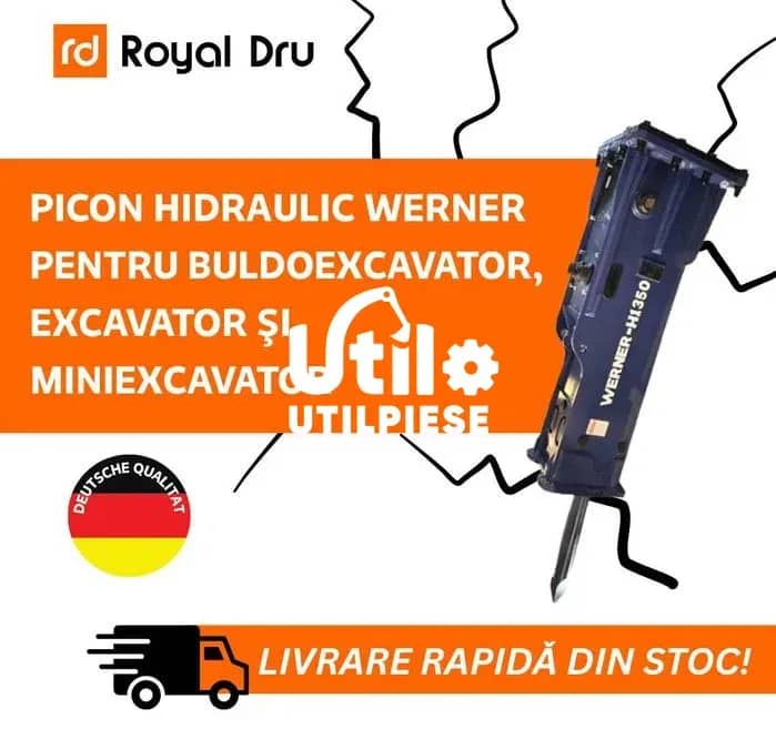Acest ciocan hidraulic Werner H340 este o piesa de schimb profesionala, noua, cu garantie completa de 12 luni, destinata utilajelor de constructii in gama 4-7 tone. Piconul este compatibil cu excavatoare si miniexcavatoare de la branduri renumite precum Caterpillar, JCB, Hitachi, Takeuchi, Bobcat, Komatsu, Kubota, Hyundai si Volvo. Aceasta piesa de schimb vine echipata complet: butelie de azot, 2 spituri de 68mm, furtune hidraulice standard si documentatie tehnica. Cu o energie de impact de 720 Jouli si o frecventa reglabila intre 500-900 lovituri pe minut, ciocanul asigura performante superioare in demolari, spargeri beton, excavari in roca si lucrari de demontare. Debitul de ulei necesar este 40-70 litri/minut, ceea ce il face compatibil cu majoritatea utilajelor din aceasta clasa de tonaj. Greutatea de 357 kg asigura echilibrul perfect intre putere si manevrabilitate. Oferim piese de schimb originale Werner cu stoc permanent si suport tehnic complet pentru montaj si intretinere. Disponibil la utilpiese- furnizor de piese second-hand si noi pentru utilaje de constructii.