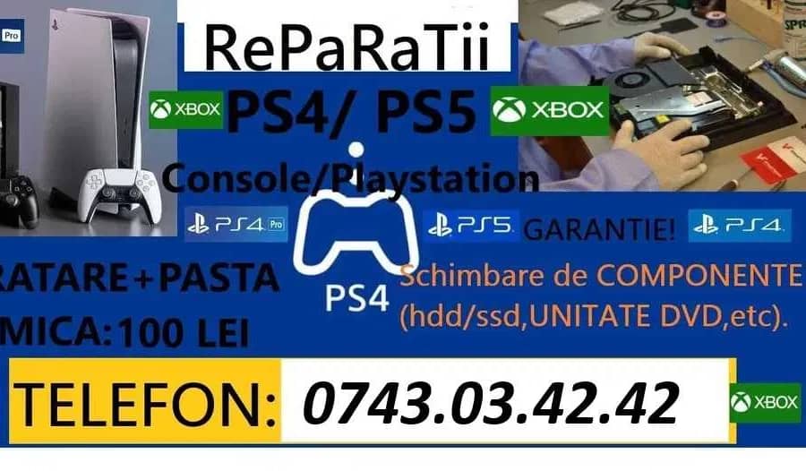 Service autorizat, din anul 2001 Reparam cu profesionalism Console Ps4, Ps4 Slim, Ps4 Pro ,curatam, înlocuim pasta termoconductoare console ps4, ps5. NU REPARAM MANETE/CONTROLERE!