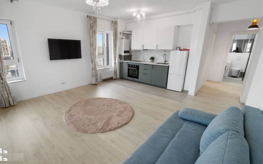 Bucataria moderna de 7.62 mp este complet mobilata si utilata cu frigider, hota, plita si cuptor, fiind conceputa pentru functionalitate si confort. Holul generos, de 6.61 mp, este prevazut cu spatii de depozitare si masina de spalat rufe. Baia eleganta, de 5.18 mp, este dotata cu dus walk-in si finisaje moderne.