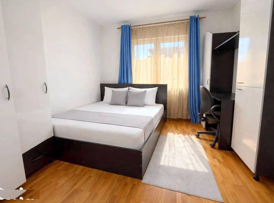 Apartamentul este situat la etajul 1 din 4, are centrala termica proprie, este decomandat si este compartimentat astfel: 2 dormitoare sunt fiecare cu pat dublu si cu dulap pentru haine, a treia camera, living-ul, este cu canapea extensibila, cu dulap mare pentru haine si cu mobilier, bucatarie spatioasa care este dotata cu cuptor electric, hol, 2 bai din care o baie este de serviciu iar a doua baie este cu cada, 2 balcoane din care un balcon este inchis.