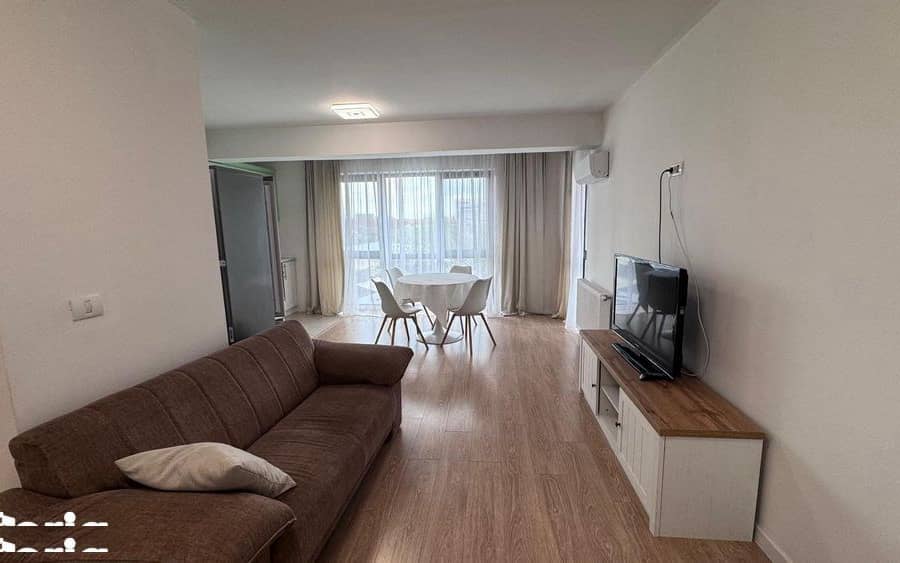 Apartamentul dispune de un hol de intrare prevăzut cu multiple spații de depozitare, un living luminos integrat armonios cu bucătăria în sistem open space, două dormitoare confortabile (dintre care unul beneficiază de ieșire în balcon) și două băi. Finisajele și amenajarea oferă un ambient plăcut și primitor, iar proprietatea se închiriază complet mobilată și utilată, fiind pregătită pentru mutare imediată.