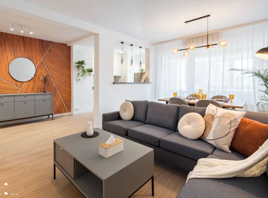 - 1 living spatios si luminos cu zona de relaxare: canapea cu 3 locuri, TV smart ,spatii de depozitare;