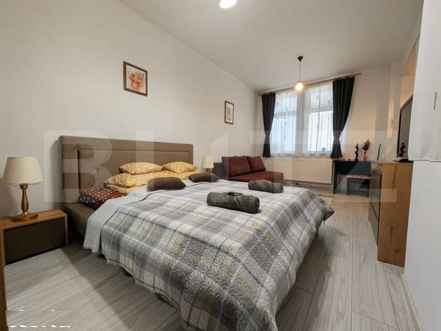 Apartament ultracentral cu 1 cameră, baie și bucătărie, complet mobilat și utilat.