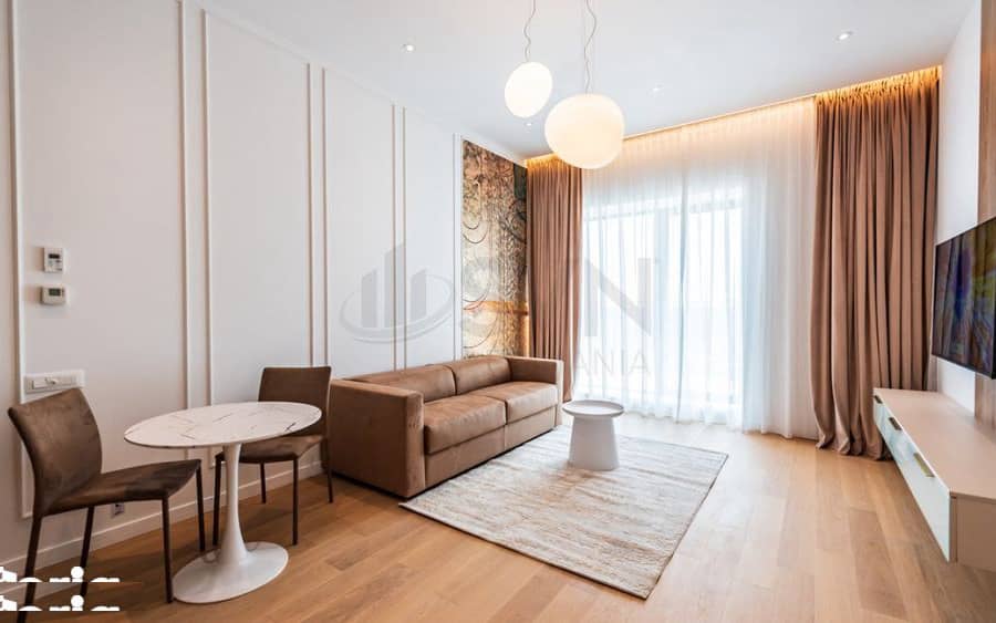Zona de zi este luminoasa si primitoare, accentuata de un perete decorativ elegant, in timp ce bucataria open-space, complet echipata, este integrata armonios in spatiul de living. Dormitorul dispune de dressing cu usi glisante din sticla fumurie, pastrand o estetica sofisticata si functionala.
