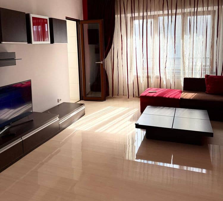 Închiriem un apartament decomandat cu 3 camere, 80 mp utili, situat la etajul 6, cu o priveliște frumoasă și multă lumină naturală. Apartamentul include două dormitoare, un living primitor, balcon, bucătărie spațioasă, baie principală cu cadă și duș, și o baie de serviciu. Este dotat cu aer condiționat, finisaje de calitate și mobilă atent aleasă.