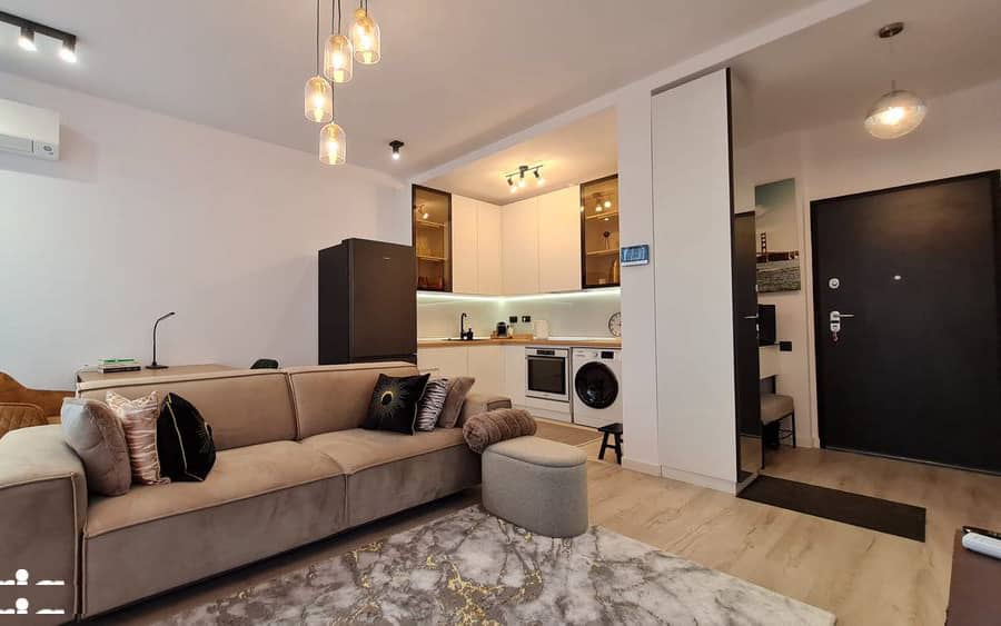 Apartamentul are o suprafata utila de 52 mp si un balcon de 4 mp si este compartipat in felul urmator: zona de intrare cu spatii depozitare pentru haine si pantofi, living spatios si luminos, mobilat cu canapea extrensibila, smart TV dimensiune mare, conectat la internet si cablu, precum si o zona delimitata pentru birou, bucatarie tip open space, echipata cu electrocasnice de cea mai buna calitate, alese cu atentie (frigider si congelator capacitate mare, marca Samsung, masina spalat rufe cu uscator incorporat Whirpool, masina de spalat vase), inclusiv cana electrica si expressor, precum si utilata in cele mai mici detalii- farfurii, pahare, tacamuri; dormitorul este mobilat cu pat dublu, un dulap incapator cu multiple rafturi precum si o comoda la fel de incapatoare, baia are dus precum si mobilier cu sertare pentru depozitare.
