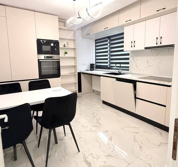 Apartament spatios cu 2 camere, bucatarie inchisa, mobilata si utilata complet cu de toate, incepand de la masina de spalat vase pana la cuptor cu microunde. Living cu iesire in balcon, spatii de depozitare amenajate cu gust, canapea extensibila, baie cu geam, dormitor cu pat matrimonial (salteaua se aduce la cerere), iesire in balcon separat.