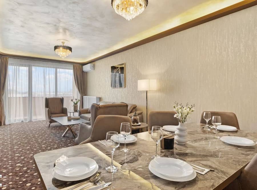 - Living spațios: mobilat elegant și dotat cu o zonă de luat masa. Include masă cu 6 scaune, aer condiționat, TV cu diagonală 55", canapea extensibilă + 2 fotolii, cu acces direct la un balcon generos.