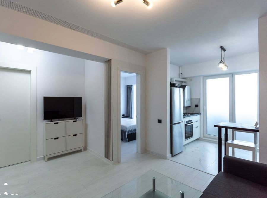 Compartimentarea este eficienta, impartita in zona de zi si zona de seara separata prin usa. Chiar daca este garsoniera, impartirea spatiului este optim, transformand-o intr-un veritabil studio.