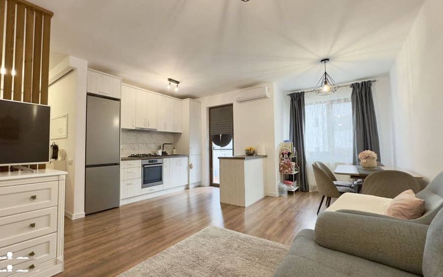 Suprafata utila de 51 mp este compartimentata in hol, living cu bucatarie, dormitor, baie cu geam, plus un balcon de 5 mp.
