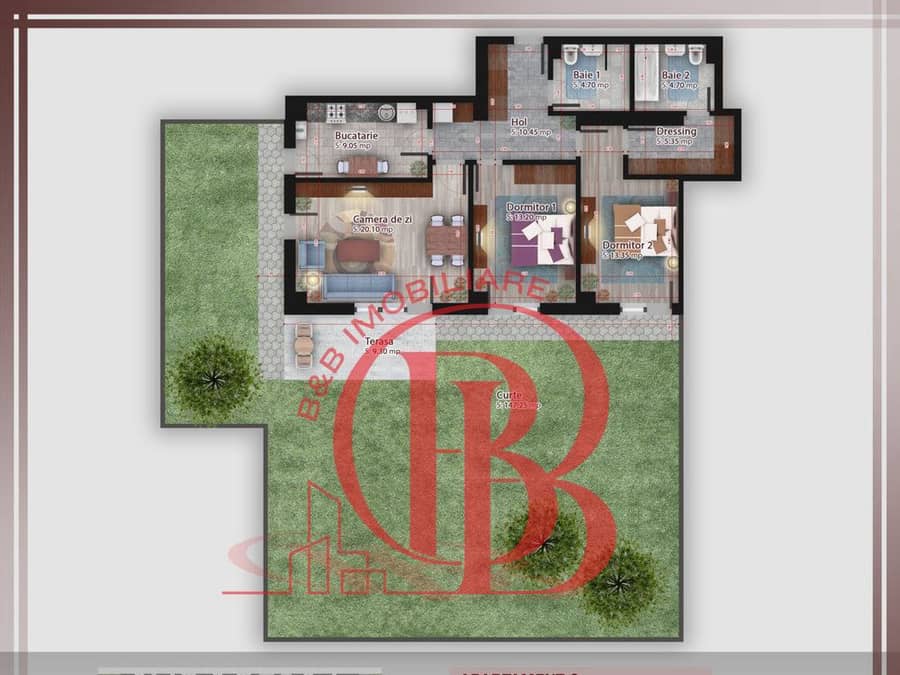 Apartamentul are o suprafata de 80.9 mp utili la interior plus un o terasa de 9.3 mp si o curte 147.25 mp (total 214 mp) si face parte dintr-un complex formtat 3 clădiri rezidențiale cu un număr total de 281 de apartamente moderne cu suprafețe variate, de la garsoniere, studiouri confortabile și apartamente cu două și trei camere, până la unități cu 4 camere. Acestora li se adauga spații verzi, spații comerciale la parterul blocului 1 și peste 290 de locuri de parcare subterane și supraterane.