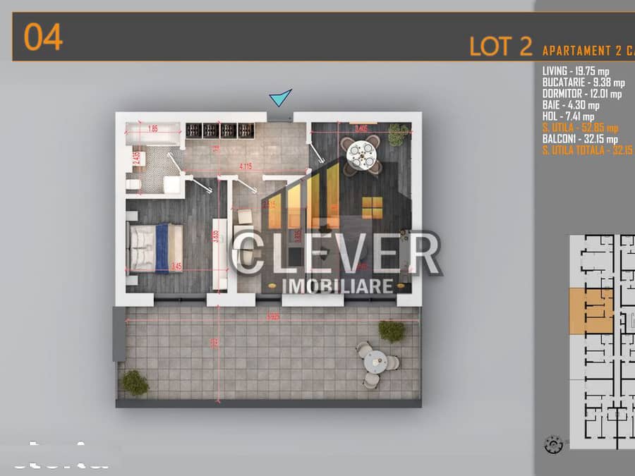 Balcon/Terasă: 32.15 mp (accesibil din toate camerele principale)