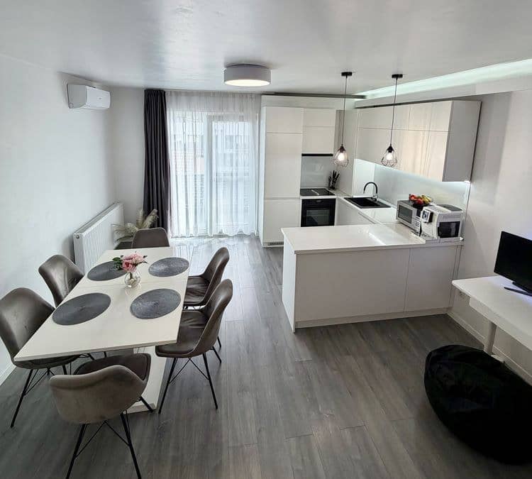 Va propunem spre vanzare un apartament cu 2 camere, finisat si mobilat modern, situat intr-un imobil finalizat in anul 2021 pe strada Traian Vuia nr. 17. Locuinta este ideala pentru cei care cauta liniste, fiind pozitionata spre spatele blocului, departe de zgomotul strazii.