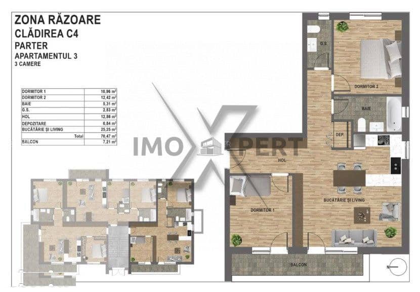 Apartamentul este compus din living cu bucatarie, 2 dormitoare, 2 bai cu geam, hol, balcon