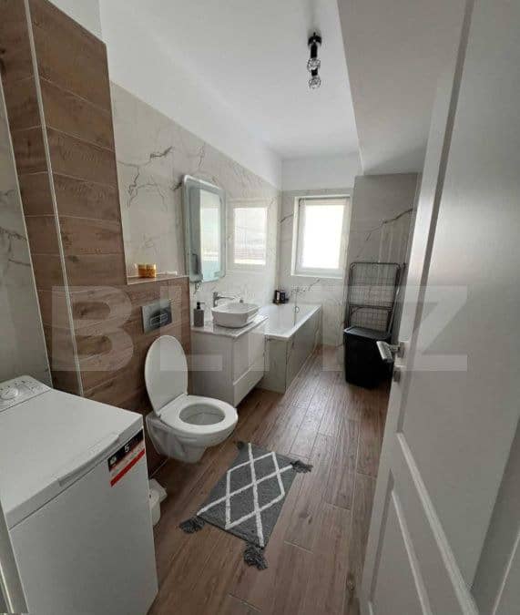Decomandat, cu bucatarie separata, mobilat, este structurat astfel: living insorit cu spatii vitrate mari si acces pe terasa, bucatarie complet mobilata si utilata, 2 dormitoare cu spatii generoase de depozitare, 2 bai, una cu vana si aerisire naturala cu geam mare, cealalta cu dus, hol si terasa de 5 mp, priveliste frumoasa catre aleile verzi din cartier.