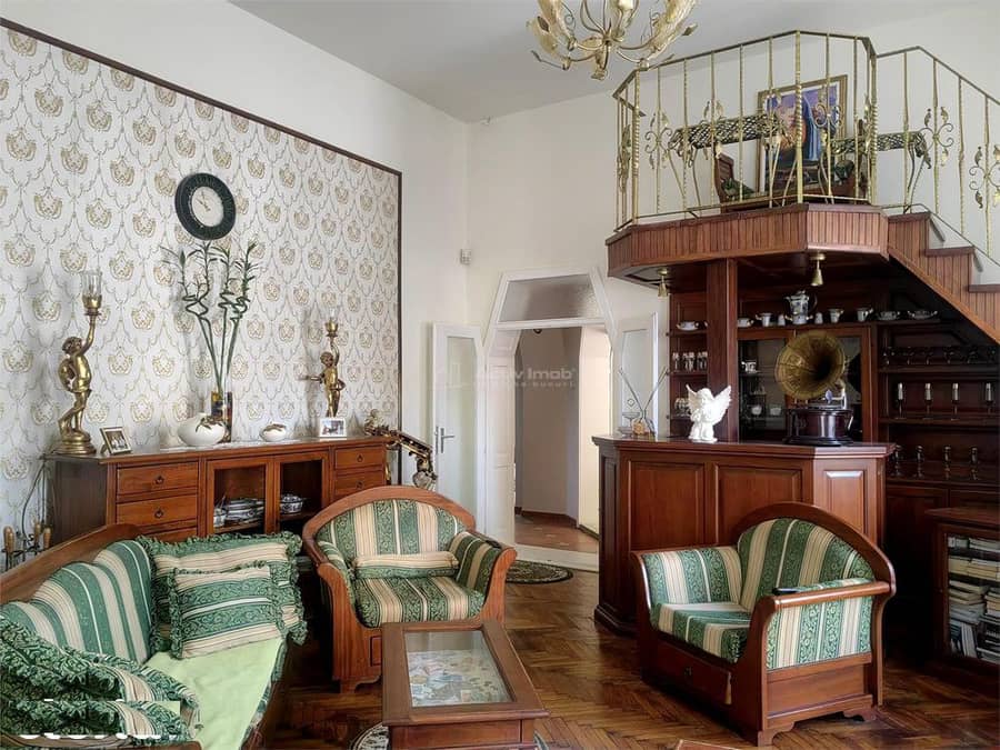 Cu o suprafața utila de 116 mp (140 mp construiți), apartamentul impresioneaza prin tavanele inalte, lumina naturala generoasa, parchetul original din lemn masiv ai elementele decorative spectaculoase. Compartimentare: