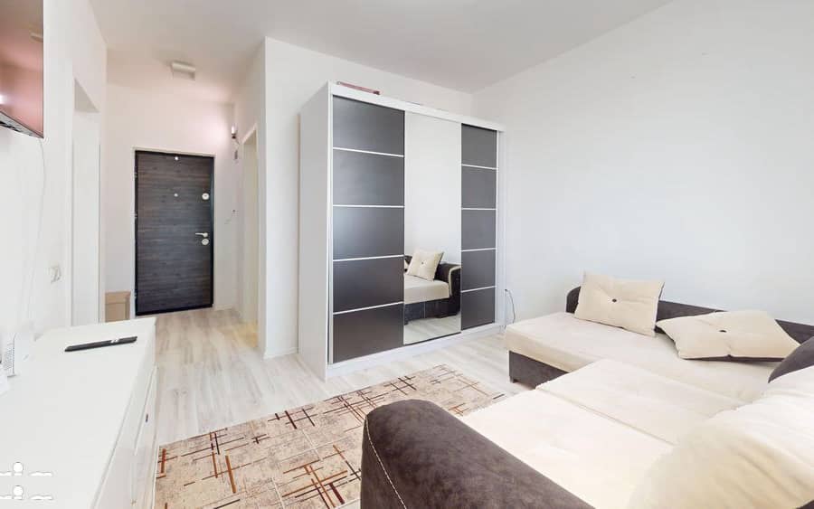 Garsoniera se predă parțial mobilată, incluzând mobilierul de bucătărie, mobilierul din baie și aparatul de aer condiționat.