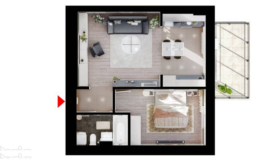 Studio dublu tip 2A, cu o suprafață utilă de 48 mp, completată de un balcon generos de 8,94 mp. Apartamentul este orientat către nord, oferind o priveliște plăcută către spațiul verde amenajat dintre blocuri.