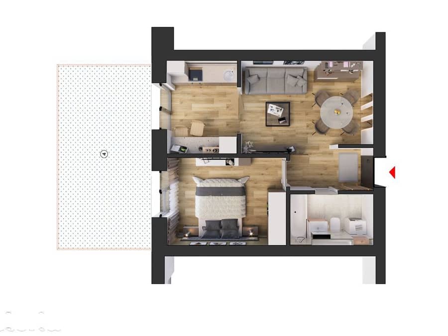Studio dublu tip 2A oferă o suprafață utilă de 42,05 metri pătrați completată cu o grădină de 20,74 metri pătrați.
