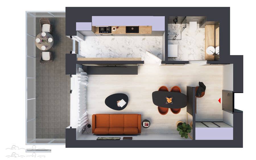Garsoniera de tip 1C impresionează prin generoasa suprafață utilă de 36.26 metri pătrați completată de un balcon cu suprafața de 11.89 metri pătrați.