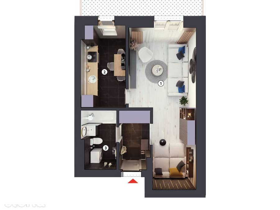 Garsoniera de tip 1D impresionează prin generoasa suprafață utilă de 39,4 metri pătrați completată cu o grădină de 23,73 metri pătrați.