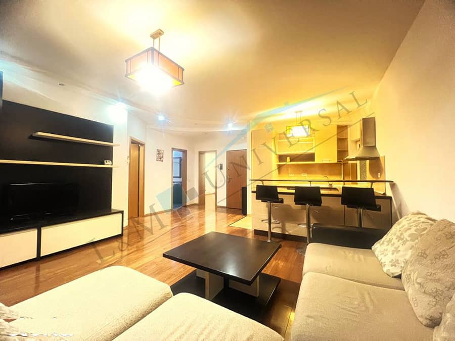 Apartamentul beneficiaza de finisaje de calitate, pardoseli placate cu gresie in bucatarie si cele baie, pardoseli placate cu parchet in living, holuri si cele doua dormitoare, tamplarie pvc cu geam termopan, placi ceramice intre blatul de lucru si dulapul superior in bucatarie, pereti placati cu placi ceramice in baie, usi interior din lemn, instalatii sanitare si electrice noi, usa metalica la intrarea in apartament, o unitate de aer conditionat.