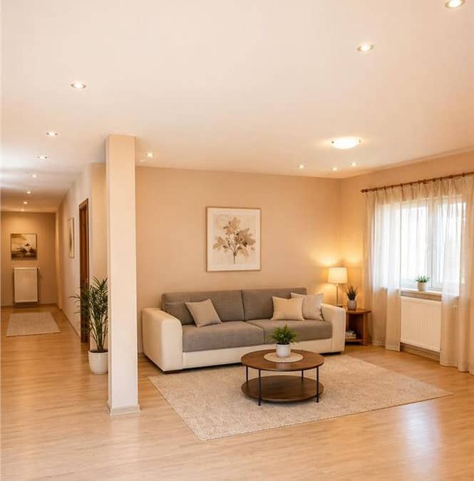 Locuința oferă un spațiu bine organizat, cu zone generoase și funcționale, potrivit atât pentru locuit permanent, cât și ca investiție.