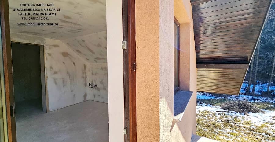 CASĂ P+M ȘI 1400 MP TEREN, LÂNGĂ PĂRĂU ȘI PĂDURE, PRETABILĂ PENTRU LOCUIT SAU PENSIUNE TURISTICĂ, 120.000 EURO Iubitorilor de natură, verde, liniște și aer curat, interesați să achiziționeze o proprietate în sânul naturii, FORTUNA IMOBILIARE le propune această casă P+M, situata într-o zonă liniștită, cu un peisaj natural de vis, la 18 km de centrul Mun. Piatra Neamț - com. Piatra Șoimului. Proprietatea, cu un vibe aparte în peisajul local, este compusă din suprafața de 1.400 mp teren, pe care în 2011 s-a edificat o casa P+M, ce poate fi transformată oricând în locuință atrăgătoare pentru familie, sau pensiune, grație versatilității proiectului și al potențialului turistic al zonei. Este construită pe fundații din beton armat, zidărie din bolțari, cu termosistem exterior integral din polistiren austrotherm de 10 cm, prevăzută cu feronerie din termopan și acoperit cu tablă profilată tip Lindab. Are suprafața construită la sol de 104 mp, suprafața construită desfășurată de 208 mp și următoarea compartimentare: - La parter : hol, living, bucătărie, 2 dormitoare, baie, camera centralei și o terasă mare acoperită cu ieșire din living și din bucătărie și cu vedere la pârâu și la pădure; - La mansardă : hol, 4 dormitoare fiecare cu ieșire în balcon, 2 băi, dressing și o mică cameră administrativă. Casa are exteriorul finalizat, iar pe interior mai sunt necesare unele lucrări. Sunt executate instalațiile electrică, sanitară și termică. Este conectată la rețeaua publică de electricitate, iar apa se obține din sursă naturală proprie prin intermediul unei fântâni. Proprietatea este prevăzută cu fosă. Deține o curte amplă, cu deschidere stradală de 29 ml la drum asfaltat. Preț 120.000 EURO Pentru o prezentare detaliată a acestei oferte, furnizarea unor informații suplimentare referitoare la situația juridică identificarea imobilului și programarea unei vizionări, vă invităm la sediul nostru, Fortuna Imobiliare, situat pe str. M. Eminescu, nr. 35, ap. 13, parter, lângă fostul Tribunal, tel. contact 0755.270.041. Your comfort is our priority ! Oferta noastră completă o găsiți aici: