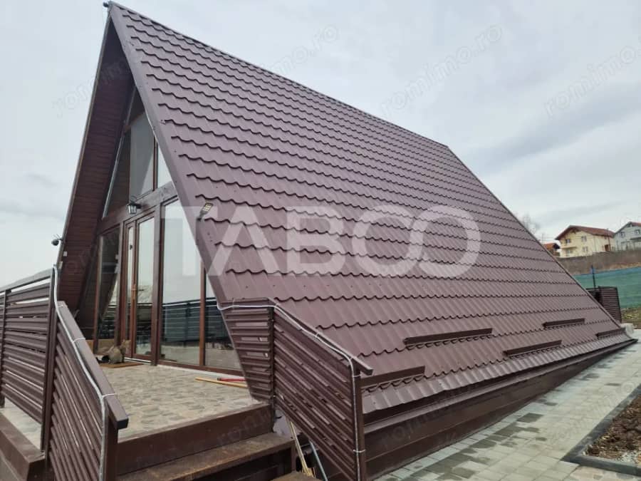 Casa individuala de tip A-frame, de vanzare, cu priveliste panoramica peste dealurile din Daia Noua, la doar 5 km de intrarea in orasul Sibiu. Construita pe un teren intravilan, inscris in eTerra, cu suprafata totala de 586 mp, aceasta insumneaza o suprafata utila de 125 mp, distribuita pe 2 nivele: la parter, 75 mp, compusi din bucatarie cu living, camera si baie, iar la etaj, 50 mp, sunt prezente doua dormitoare, accesul facandu-se pe o scara interioara. Acoperisul este construit din tigla metalica cu izolatie corespunzatoare. In materie de utilitati, avem urmatoarele: - Curent electric - pentru buna functionalitate a casei; - Curent trifazic - urmeaza a se adauga; - Sursa de apa - prezenta prin intermediul fantanii la care au fost adaugate 6 burlane; - Statie de epurare - inlocuitor perfect pentru canalizare; - Pompa de caldura - cu incalzire prin calorifere; - Aer conditionat - pentru propriul confortul. Predarea acesteia se face la stadiul de cheie, cu finisajele interioare facute si baia amenajata cu sanitare. Accesul la proprietate se face pe un drum de 250 m de la DJ106, inca neamenajat, de pamant. Pretabila pentru casa de vacanta, iar achizitia se poate face atat prin credit cat si prin surse proprii.