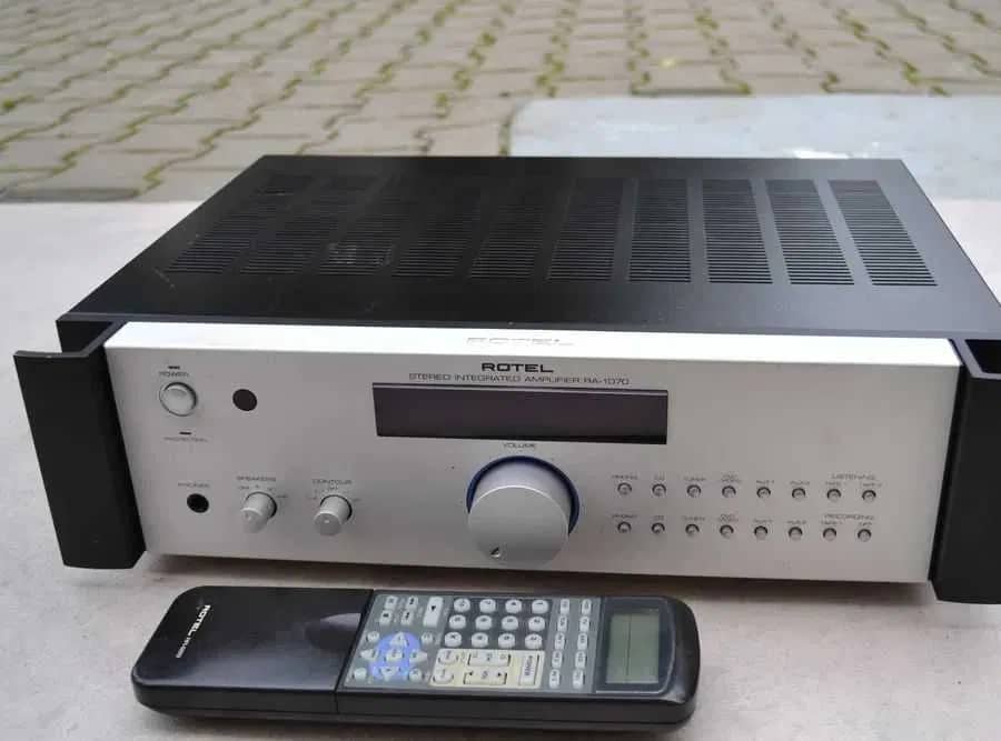 Amplificator Rotel RA 1070 cu Telecomanda: 8 intrari, 4 iesiri, 4-16 ohmi, 400W consum, traf toroidal, mufe aurite, 2 radiatoare, 12 finali, 4 condenstori filtraj, afisaj, low/high, poze reale.