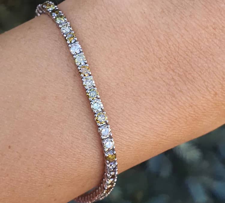 Bratara Tennis din Aur 14 kt cu 58 Diamantele Naturale Fancy Mixt Culori(roz,galbene,champagne,orange) de 5.62 carate ,taietura Brilliant,culori intense,claritate superioara VS1-SI2. Greutate:9.14 gr.Marime:18 cm.