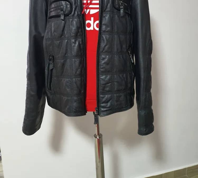 Geaca piele naturala nappa, model stil bikker, cu imprimeu deosebit în partea din fata si in zona mânecilor, merge la ținute casual;