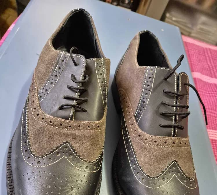 Acesta este un model de pantofi bărbătești eleganți de tip Oxford sau Brogue, produși de brandul Clifford James. Pantofii au un design bicolor (negru și gri), fiind confecționați dintr-o combinație de piele netedă și piele întoarsă (suede) pe partea superioară.