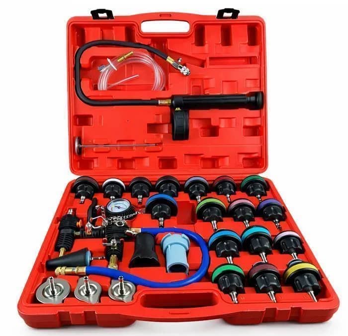 Acest TESTER VERIFICARE SISTEMUL DE RACIRE 28 PIESE GEBO TOOLS este solutia completa pentru diagnosticarea rapida a scurgerilor de lichid de racire si pentru reumplerea eficienta a sistemului de racire cu ajutorul pompei de vid.