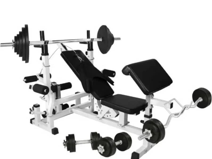 Acest set îți permite să lucrezi toate grupele musculare: umerii, pieptul, brațele, picioarele, abdomenul și spatele, oferindu-ți o experiență de antrenament de nivel înalt. Ce include banca multifuncțională: Spătar cu modul de tragere prin cablu, reglabil în 6 direcții. Suport pentru greutăți cu bară de siguranță și mânere integrate, reglabil în 5 poziții. Curl pad cu suport pentru gantere, reglabil în 3 direcții. Presă pentru picioare, reglabilă în 3 direcții. Suporturi convenabile pentru depozitarea echipamentului neutilizat. Dimensiuni (L x l x h): Dimensiuni totale: aproximativ 175 x 122,5 x 70 cm Dimensiuni interioare suport pentru gantere: 60 cm Dimensiuni exterioare suport pentru gantere: 70 cm Pad spate: 68 x 28 x 4 cm Înălțime șezut: 44 cm Pad ondulat: 28 x 44 x 4 cm (lățimea raftului aprox. 32,5 cm) Lungimea brațelor fluture: aproximativ 30 cm Lungimea suportului pentru disc curl picioare: 23,5 cm Capacitate maximă: Brațe fluture: 40 kg fiecare Greutate suport: 180 kg Greutatea proprie a multisalei: 40 kg Set complet de greutăți (total 108 kg): 6 x discuri de 1,25 kg 6 x discuri de 2,5 kg 2 x discuri de 5 kg 2 x discuri de 10 kg 2 x discuri de 15 kg 1 x bară SZ de 120 cm – 8 kg 1 x bară de 170 cm – 10 kg 2 x bare pentru gantere de 35 cm – 2,5 kg fiecare 8 x cleme stea pentru fixarea greutăților Cu acest set complet de 108 kg, inclusiv barele și discurile din cauciuc, îți vei putea personaliza antrenamentele și vei beneficia de o gamă largă de exerciții pentru dezvoltarea completă a corpului, totul în confortul propriei tale case.